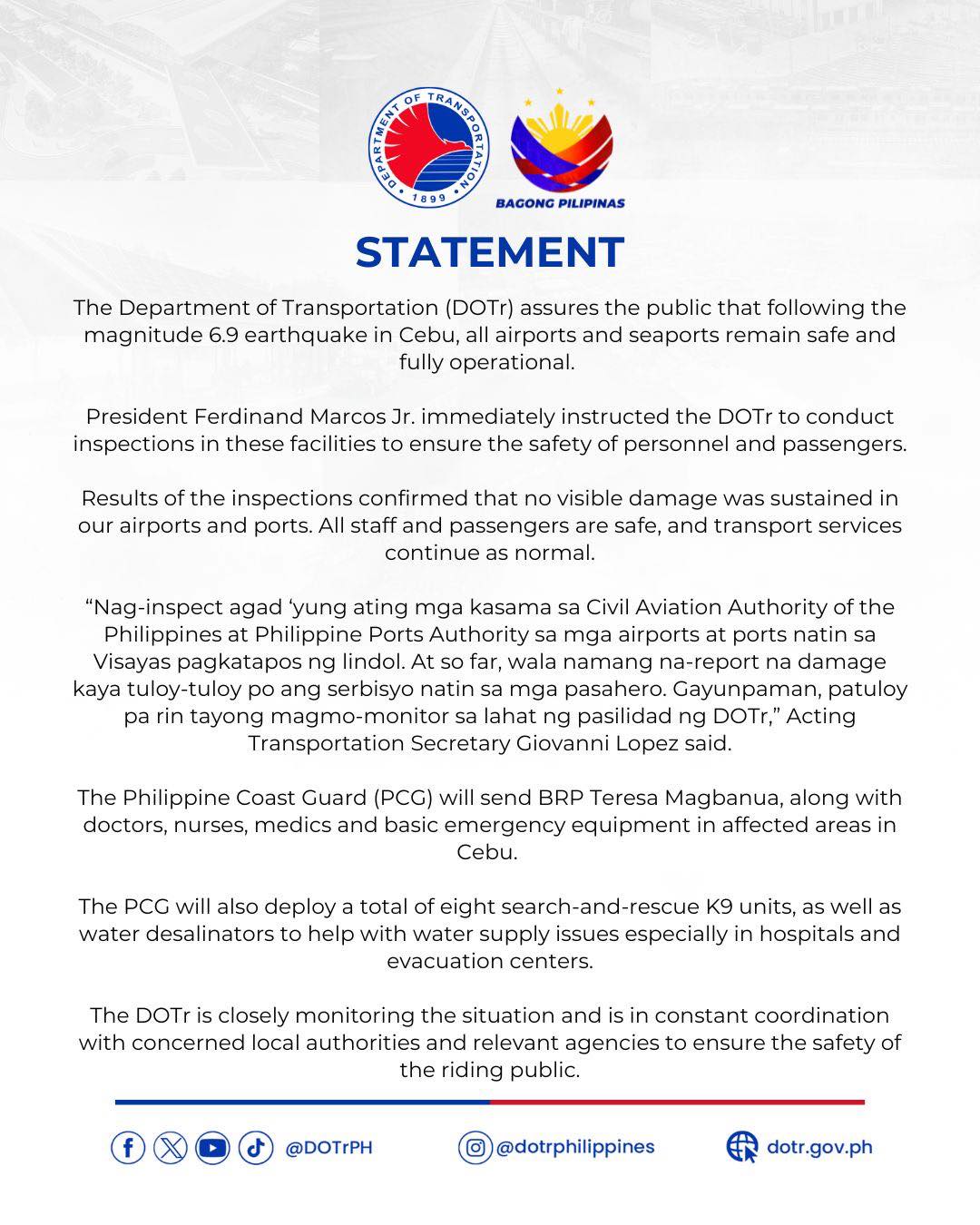 The Department of Transportation (DOTr) announced Wednesday that all airports and seaports in Cebu remain safe and fully operational following the magnitude 6.9 earthquake.