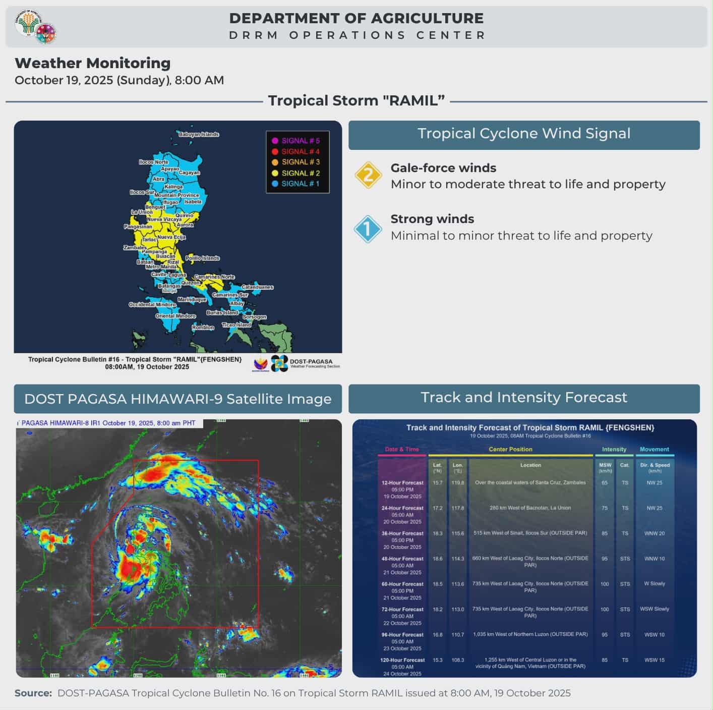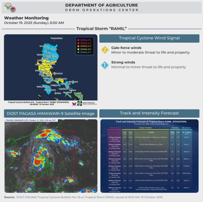 Tropical Storm Ramil is threatening 925,100 hectares of standing crops across six agricultural regions, the Department of Agriculture (DA) said in a bulletin issued on October 17.