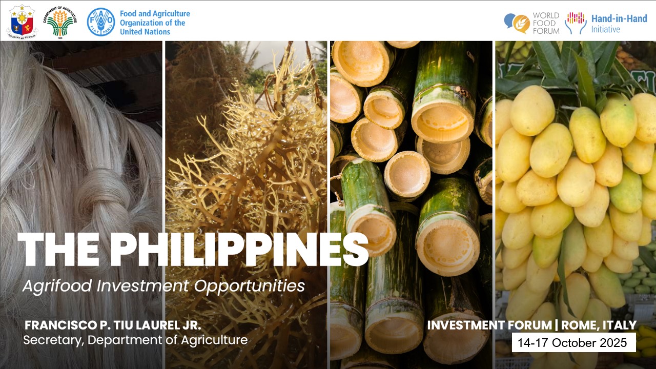 The Department of Agriculture (DA) has bared a $108.88 million agrifood investment portfolio focused on mango, abaca, seaweeds, and bamboo at the 2025 Hand-in-Hand Investment Forum during the World Food Forum hosted by the FAO on 14 October this year.