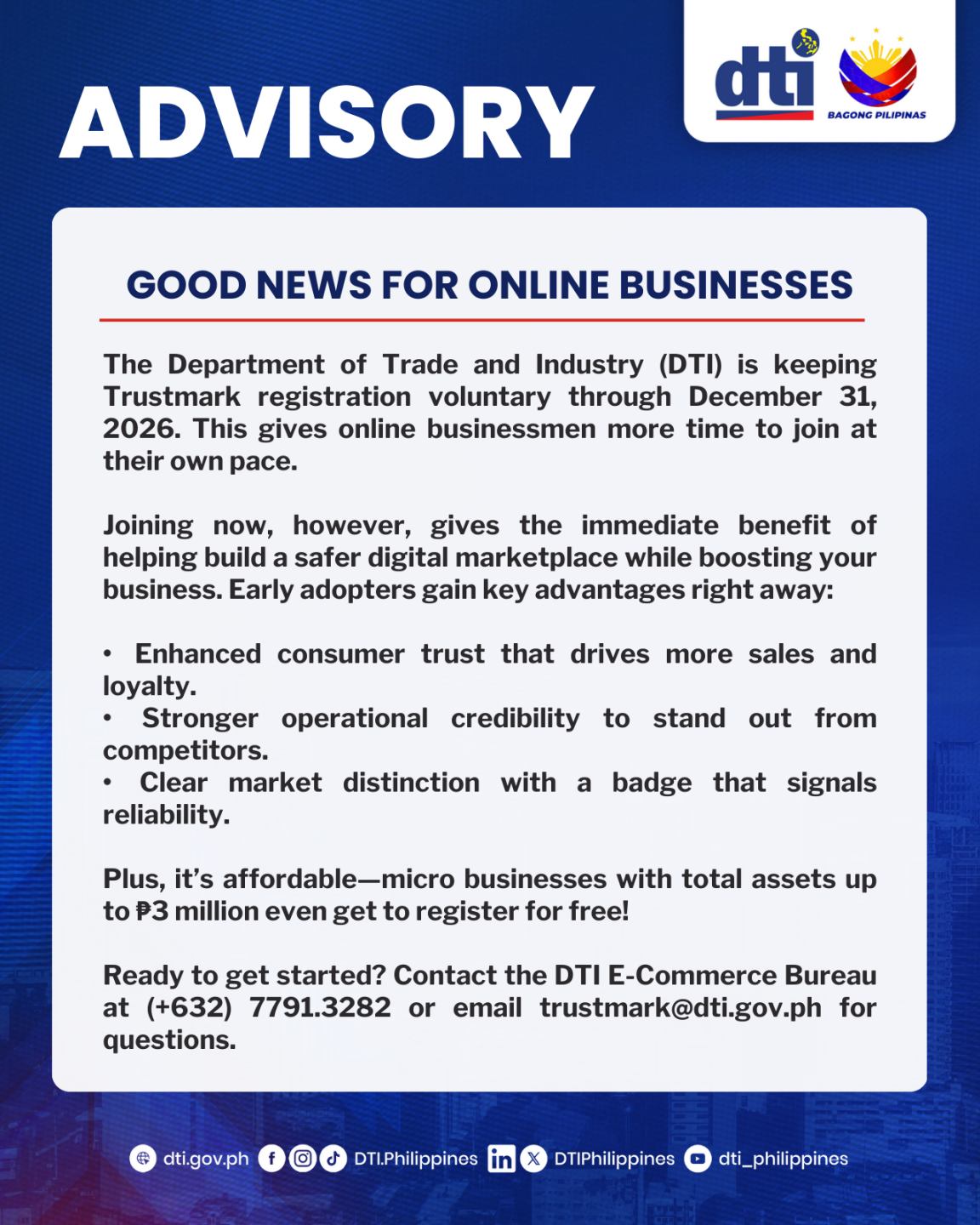 The voluntary period was previously set to end on December 31, 2025, but the DTI said it reconsidered after receiving feedback from various sectors, including business groups and platform operators. The additional year will also allow the agency to improve the Trustmark system to ensure it is useful, fair, and beneficial for both merchants and consumers.
