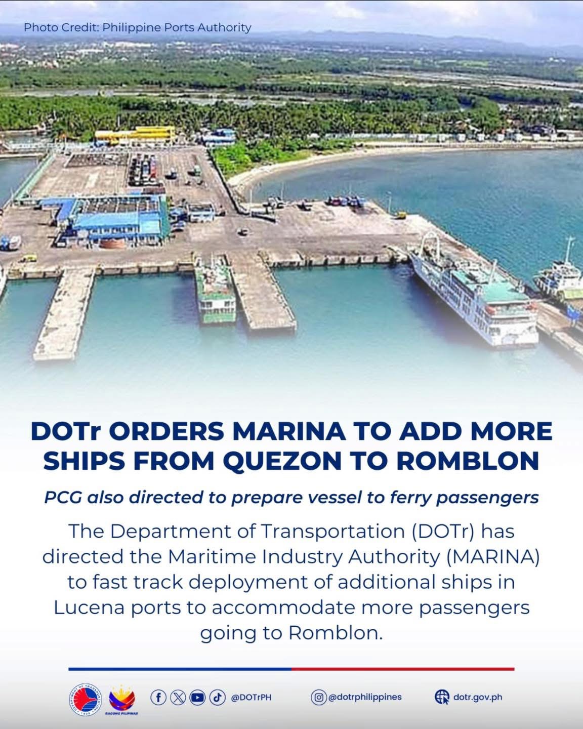 The Department of Transportation (DOTr) has ordered the Maritime Industry Authority (MARINA) to speed up the deployment of additional passenger ships at Lucena ports to uuuaddress the growing number of travelers heading to Romblon for Christmas.