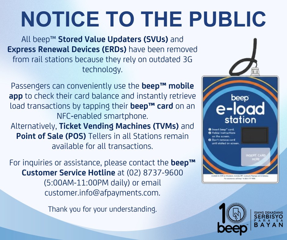While the machines are unavailable, passengers can still check their Beep card balance and view recent load transactions using the beep mobile app by tapping their card on an NFC-enabled smartphone. Ticket Vending Machines (TVMs) and Point-of-Sale (POS) tellers at stations also remain available for loading and other transactions.