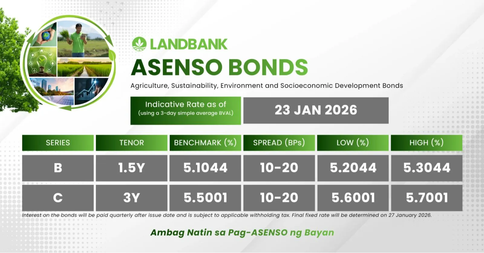 Landbank is offering Asenso Bonds Series B and C with tenors of 1.5 years and three years, respectively. Indicative yields range from 5.2287 percent to 5.3287 percent gross for the 1.5-year paper, and 5.56 percent to 5.66 percent gross for the three-year tranche.