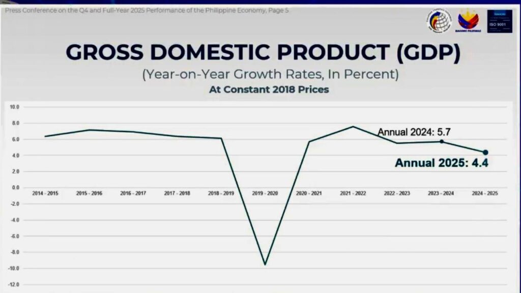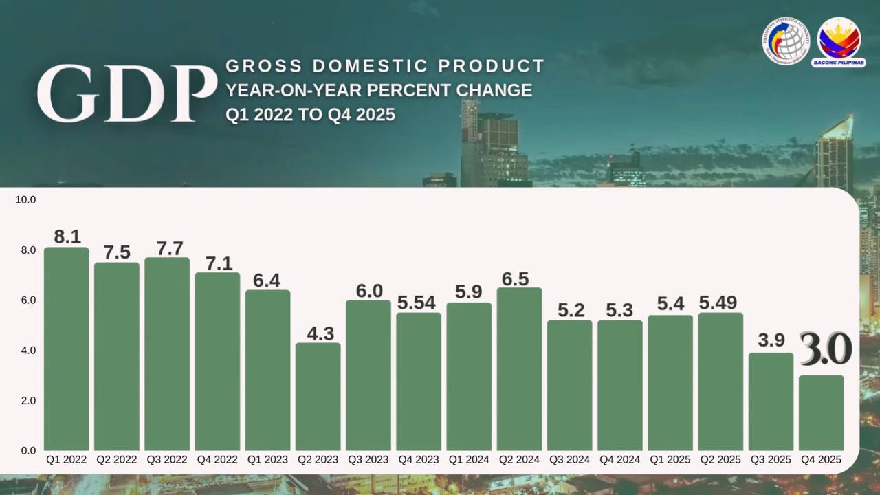 Economic Planning Secretary Arsenio Balisacan said disruptions caused by bad weather and the adverse impact on business and consumer confidence of the flood-control controversies, along with global headwinds, have undermined fourth quarter growth that was slowest since the COVID-19 pandemic, when the GDP contracted 3.8 percent in the first quarter of 2021. Full year growth was also down from 5.7 percent in 2024.