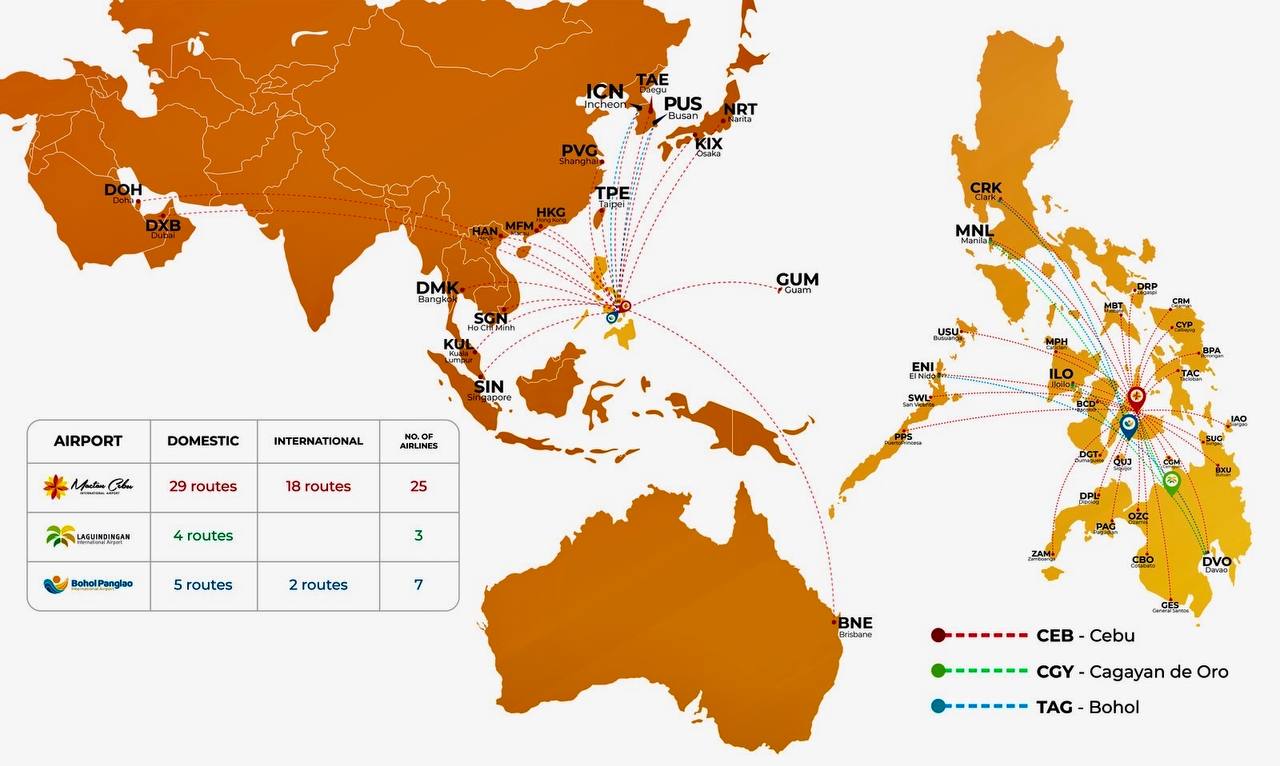 Through its three gateways—Mactan-Cebu International Airport, Bohol-Panglao International Airport, and Laguindingan International Airport—AIC now supports 29 domestic routes from Cebu, five from Bohol, and four from Laguindingan. Many are nonstop and served exclusively from its airports, giving airlines cleaner operations and passengers shorter travel times.