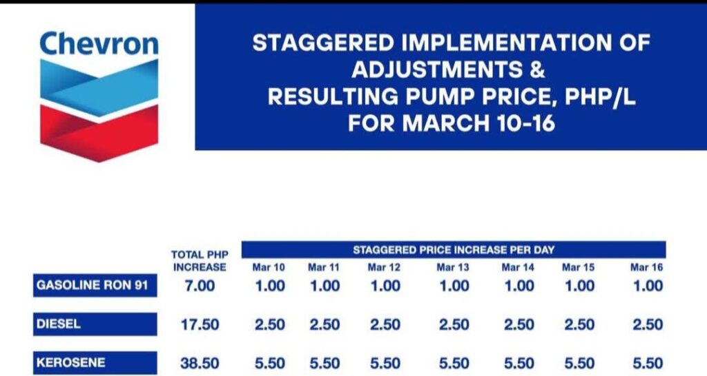 Among those adopting staggered increases are Pilipinas Shell Petroleum Corporation, Petron Corporation, Chevron Philippines, which markets the Caltex brand, Seaoil Philippines, Total Philippines, and Jetti Petroleum.