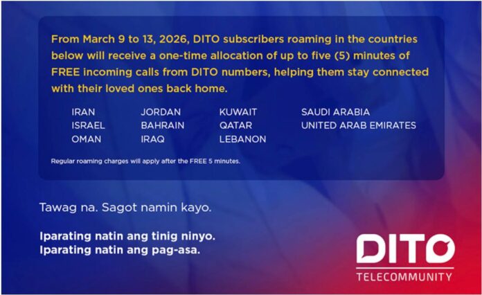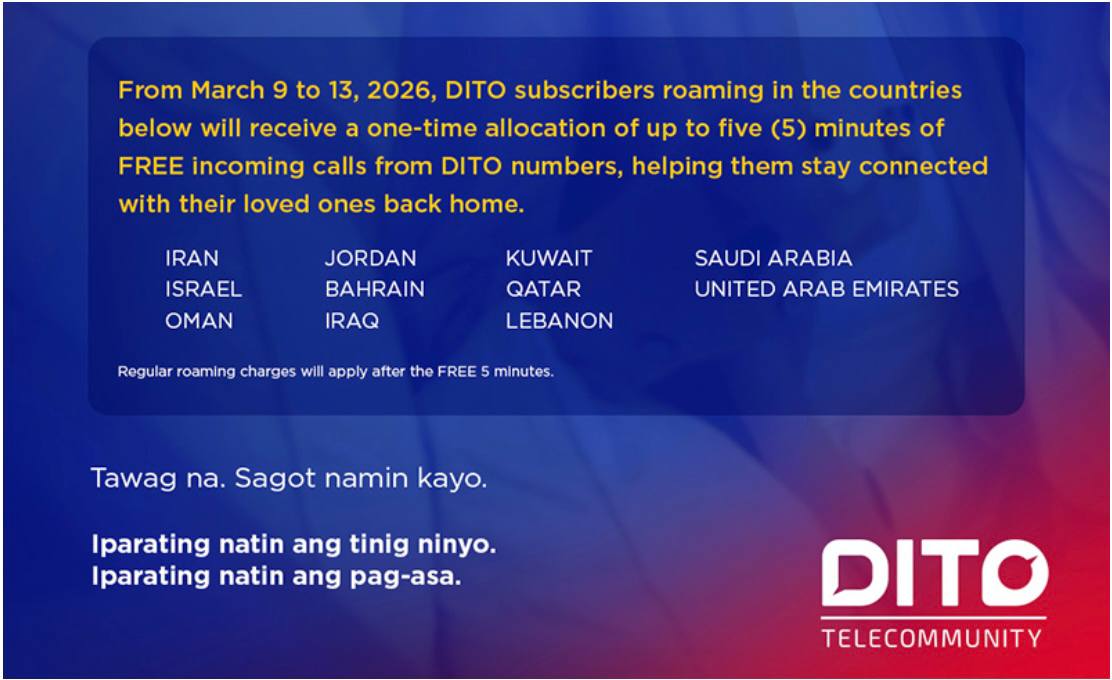 From March 9 to 13, 2026, DITO subscribers who are roaming in selected Middle East countries will receive a one-time allocation of up to five minutes of free incoming calls from DITO numbers in the Philippines. Regular roaming call rates will apply after the free five minutes.