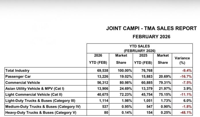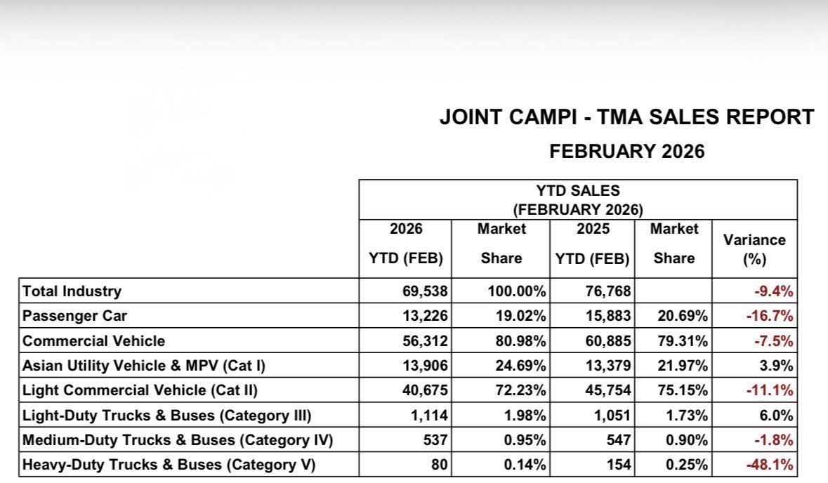 Industry data showed total vehicle sales fell 9.4 percent to 69,538 units in January–February from 76,768 a year earlier. Passenger cars took the biggest hit, plunging 16.7 percent to 13,226 units, while commercial vehicles slipped 7.5 percent to 56,312.