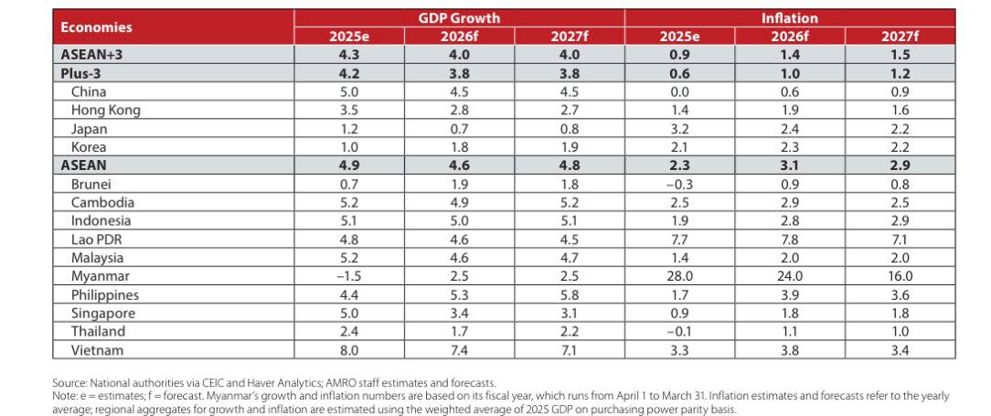 For the broader ASEAN+3 region, growth is projected to slow to 4 percent in 2026 and 2027 from 4.3 percent in 2025, while inflation is seen rising modestly to 1.4–1.5 percent.