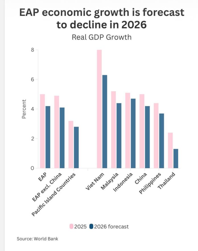 The Philippines is also seen lagging behind the regional average, with growth across the East Asia and Pacific projected to ease to 4.2 percent from 5 percent in 2025.