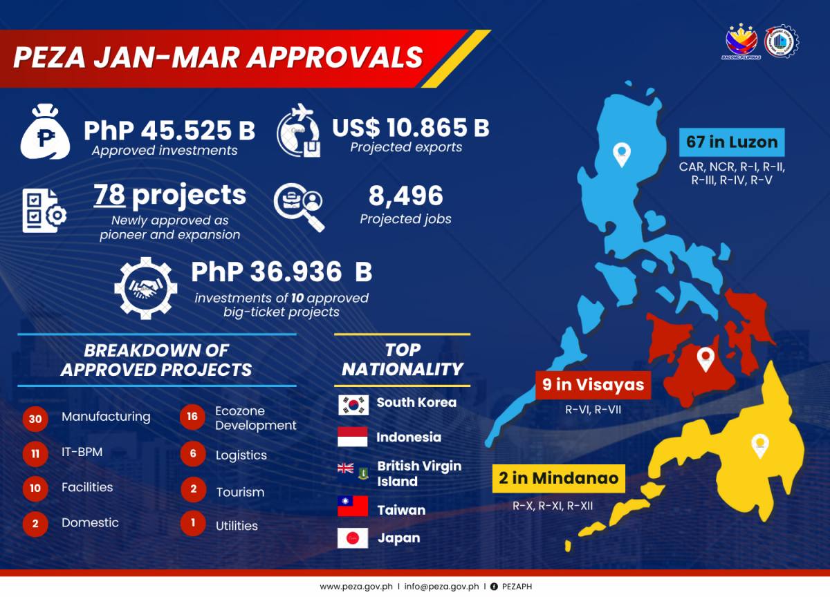 PEZA approved 78 new and expansion projects in the first quarter, up 18 percent from 66 projects a year ago, signaling sustained investor interest despite lower aggregate values.