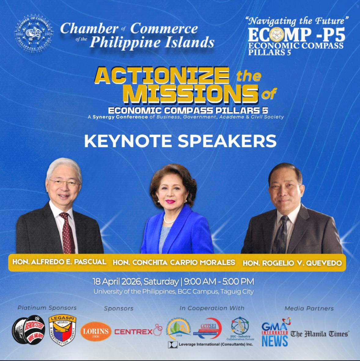 The Chamber of Commerce of the Philippine Islands (CCPI) will hold its ECOMP-P5 Synergy Conference, titled “Actionize the Missions of Economic Compass Pillars 5,” featuring prominent leaders in governance, economic development, and capital markets.